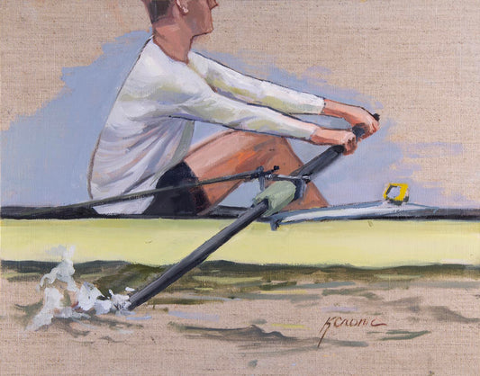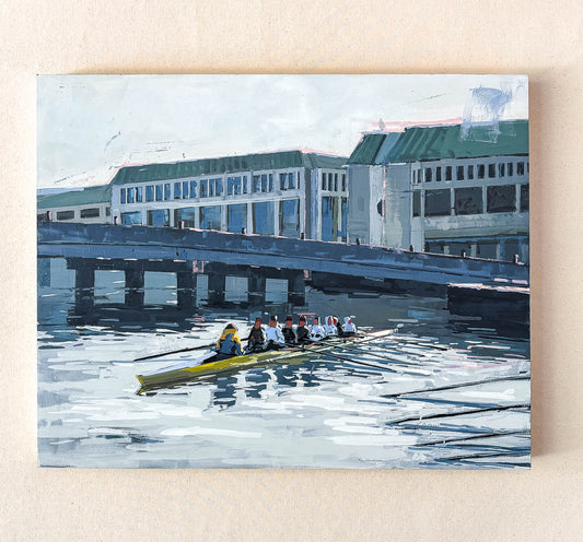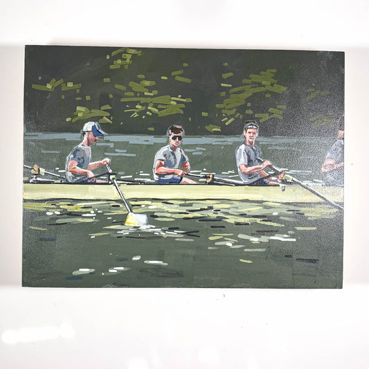 “All Eight” is a series of paintings nodding to the dedication of Navy Rowing. From catch to feather to bedding down the shells for the night, the sport requires a synchronized effort of both grit and grace. These paintings aim to explore the familiar moments in the midst of the dedication. Paintings aim to feel anonymous while inviting the viewer into their world. Images of Navy Men’s Heavyweight, Navy Men’s Lightweight, and Navy Women’s Rowing teams.