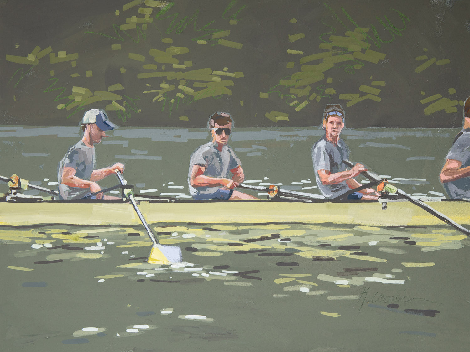 “All Eight” is a series of paintings nodding to the dedication of Navy Rowing. From catch to feather to bedding down the shells for the night, the sport requires a synchronized effort of both grit and grace. These paintings aim to explore the familiar moments in the midst of the dedication. Paintings aim to feel anonymous while inviting the viewer into their world. Images of Navy Men’s Heavyweight, Navy Men’s Lightweight, and Navy Women’s Rowing teams.