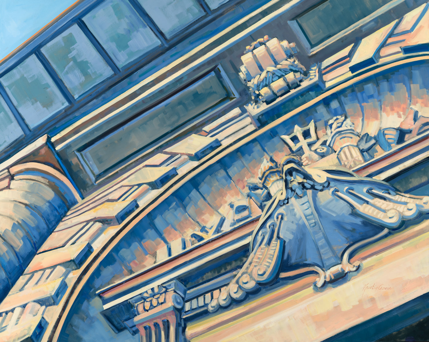 This painting is part of the “Granite and Brass” collection, exploring architectural details of the Yard and completed in 2019.