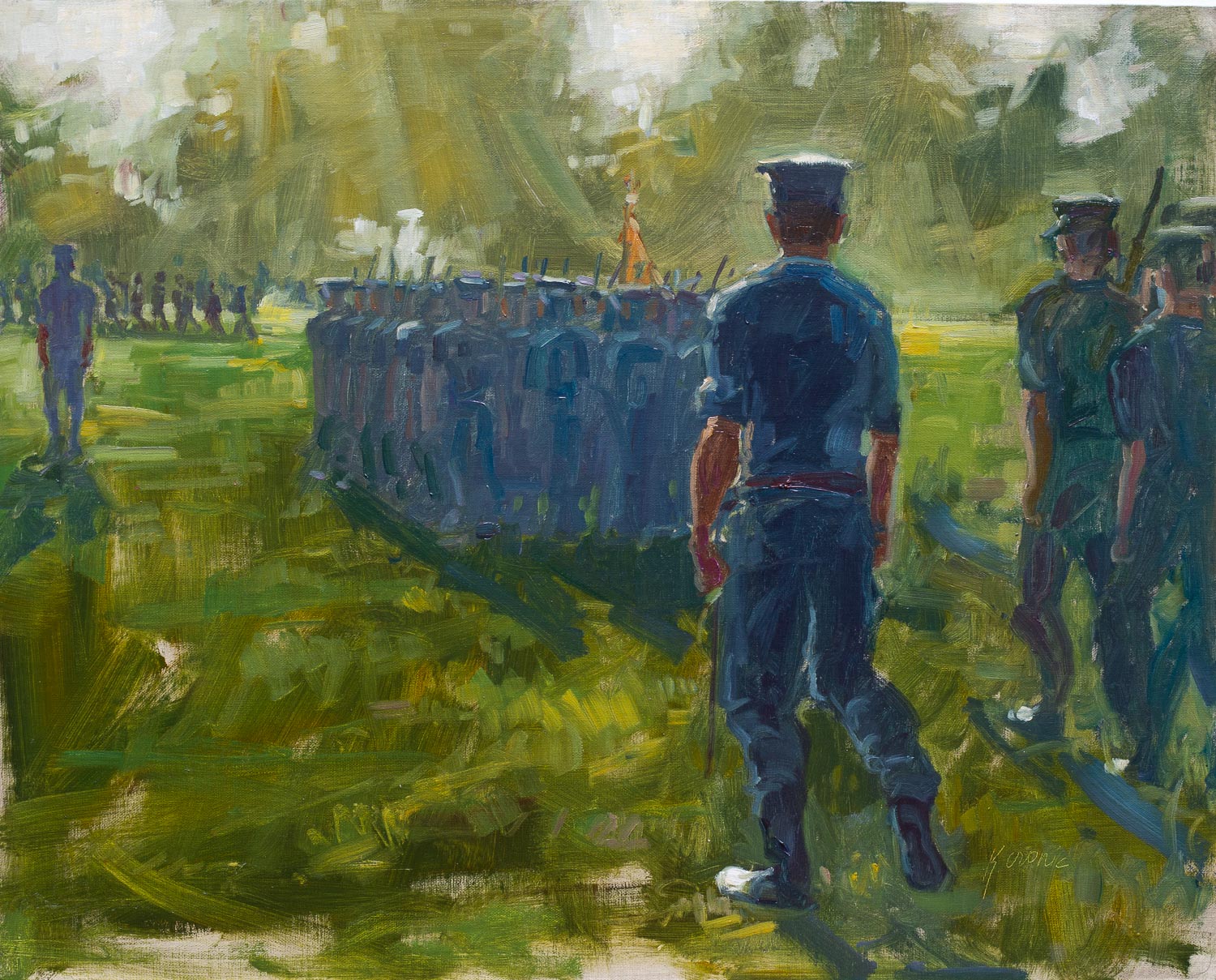This painting is part of the “Midsummer” collection, completed in 2021. Summer is a time of transition at the Naval Academy. From preparing the newest class of plebes to join the brigade, to exploring communities in the Fleet, or just enjoying the slower pace in Annapolis, summertime brings a notable change of pace.