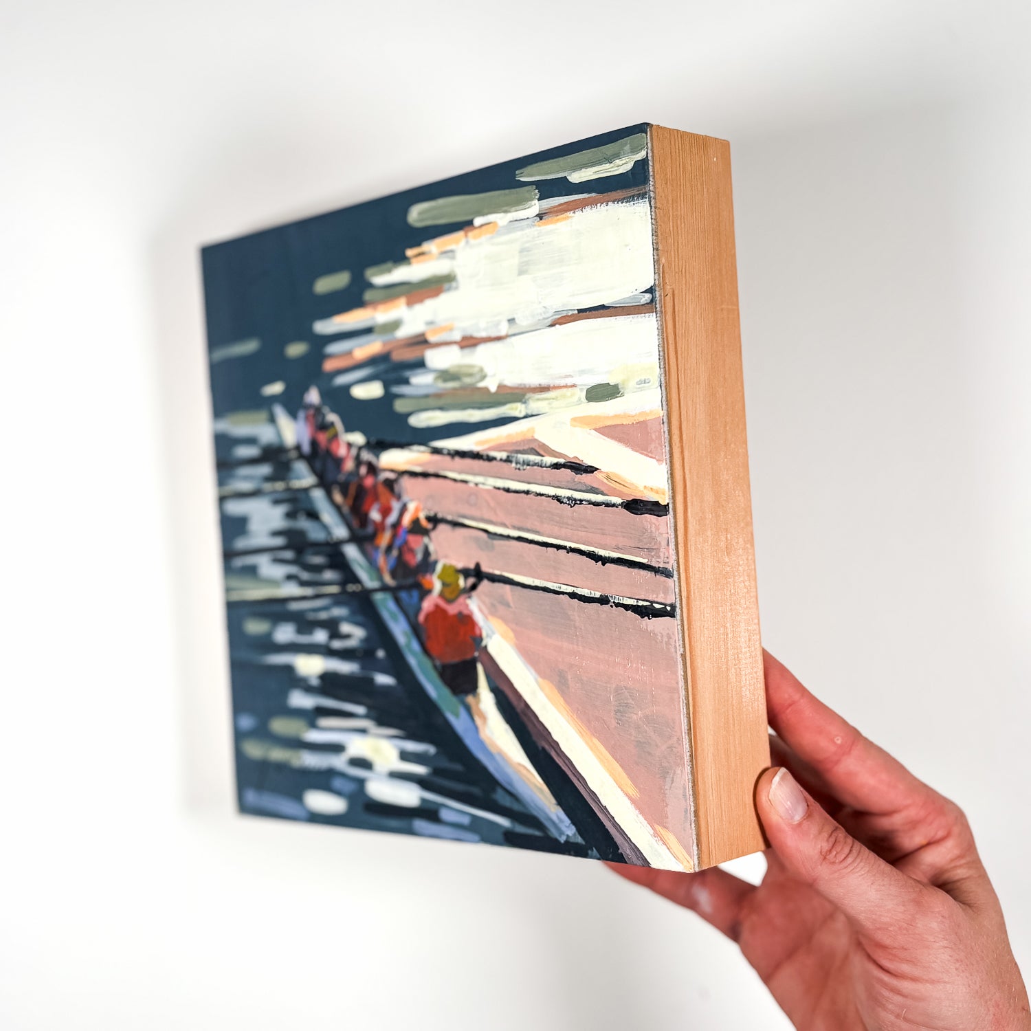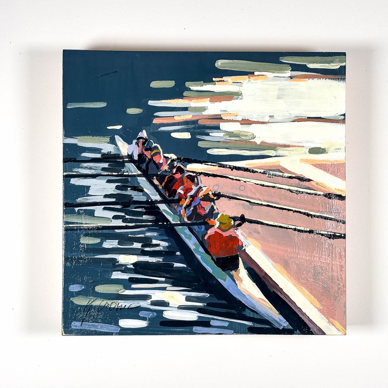 “All Eight” is a series of paintings nodding to the dedication of Navy Rowing. From catch to feather to bedding down the shells for the night, the sport requires a synchronized effort of both grit and grace. These paintings aim to explore the familiar moments in the midst of the dedication. Paintings aim to feel anonymous while inviting the viewer into their world. Images of Navy Men’s Heavyweight, Navy Men’s Lightweight, and Navy Women’s Rowing teams.