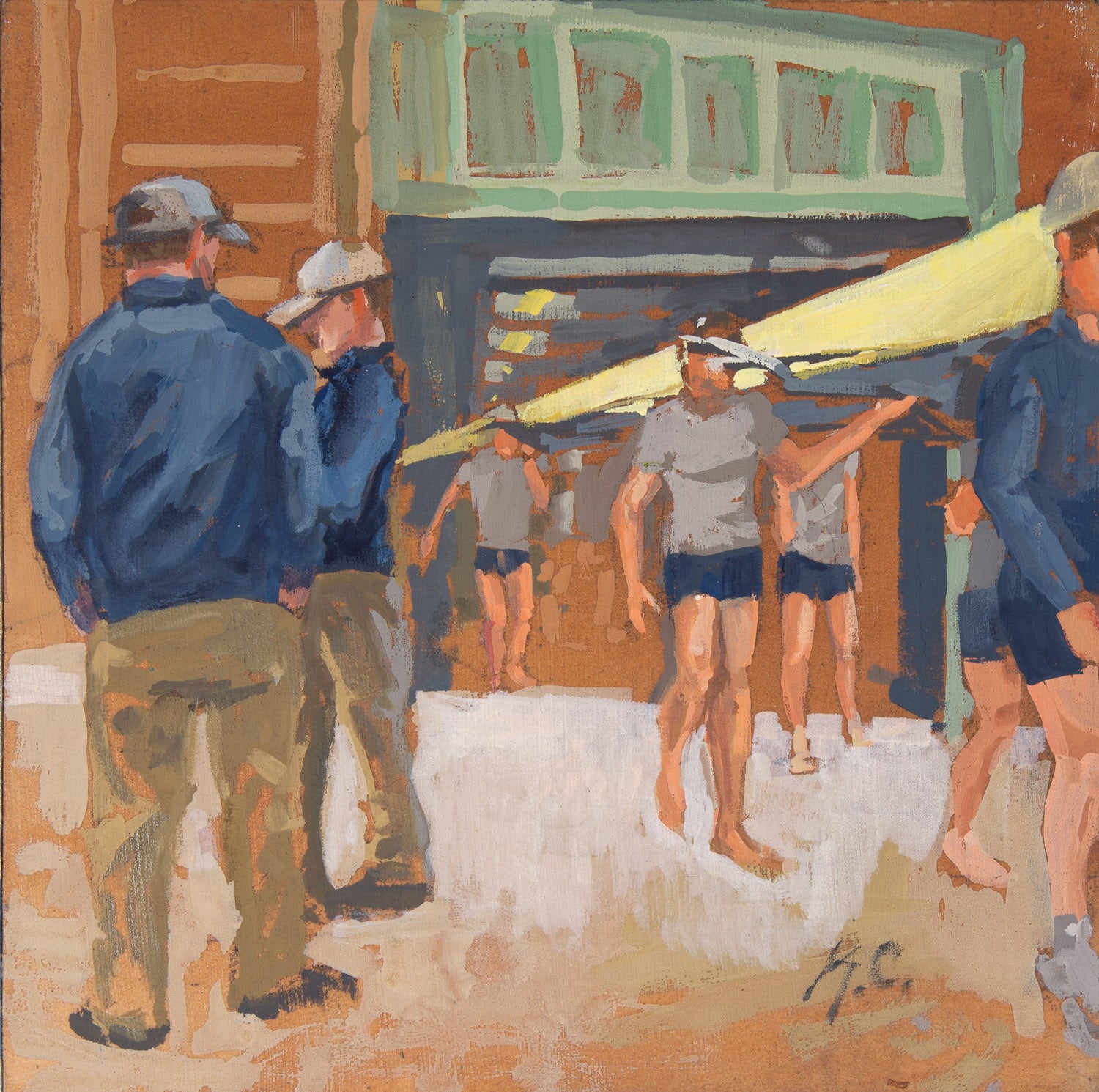 “All Eight” is a series of paintings nodding to the dedication of Navy Rowing. From catch to feather to bedding down the shells for the night, the sport requires a synchronized effort of both grit and grace. These paintings aim to explore the familiar moments in the midst of the dedication. Paintings aim to feel anonymous while inviting the viewer into their world. Images of Navy Men’s Heavyweight, Navy Men’s Lightweight, and Navy Women’s Rowing teams.