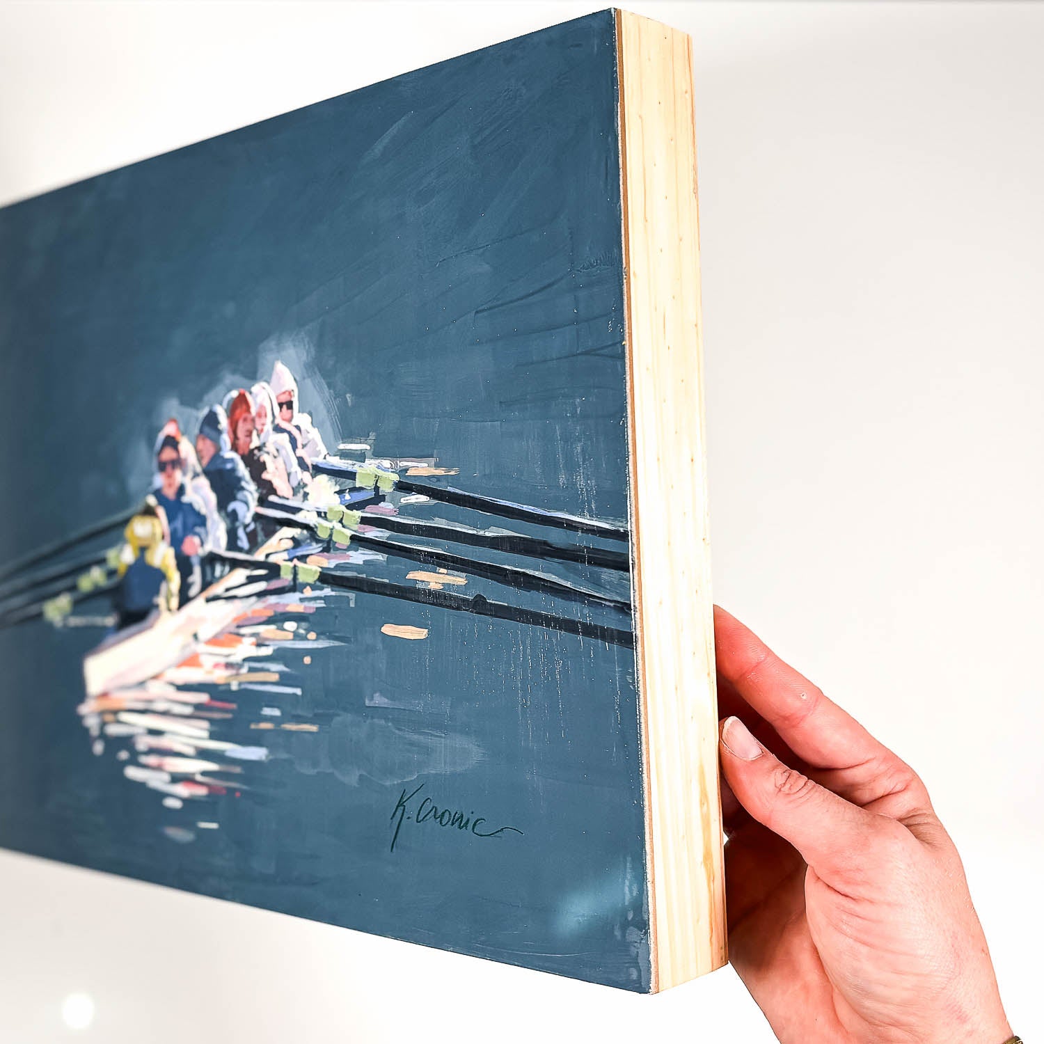 “All Eight” is a series of paintings nodding to the dedication of Navy Rowing. From catch to feather to bedding down the shells for the night, the sport requires a synchronized effort of both grit and grace. These paintings aim to explore the familiar moments in the midst of the dedication. Paintings aim to feel anonymous while inviting the viewer into their world. Images of Navy Men’s Heavyweight, Navy Men’s Lightweight, and Navy Women’s Rowing teams.