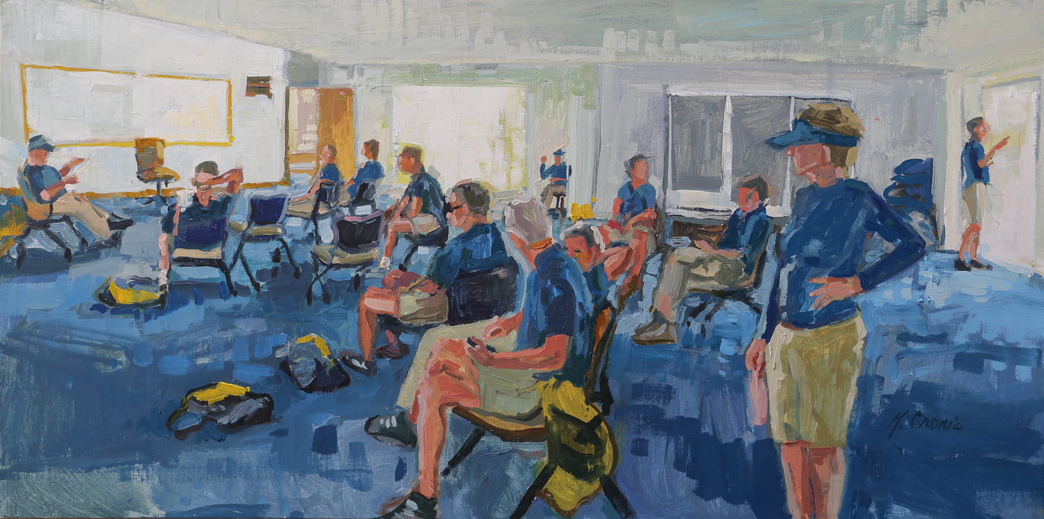 This painting is part of the “Spinnaker Skyline” series, created between 2022 and 2024. This series explores the light, emotion, and teamwork of sailing at the United States Naval Academy. Depicting a range of offshore sailing (VOST) and small boats, this collection of paintings is full of vibrant color and energetic brushwork, celebrating both those beloved views on the water and the teamwork that makes it happen.