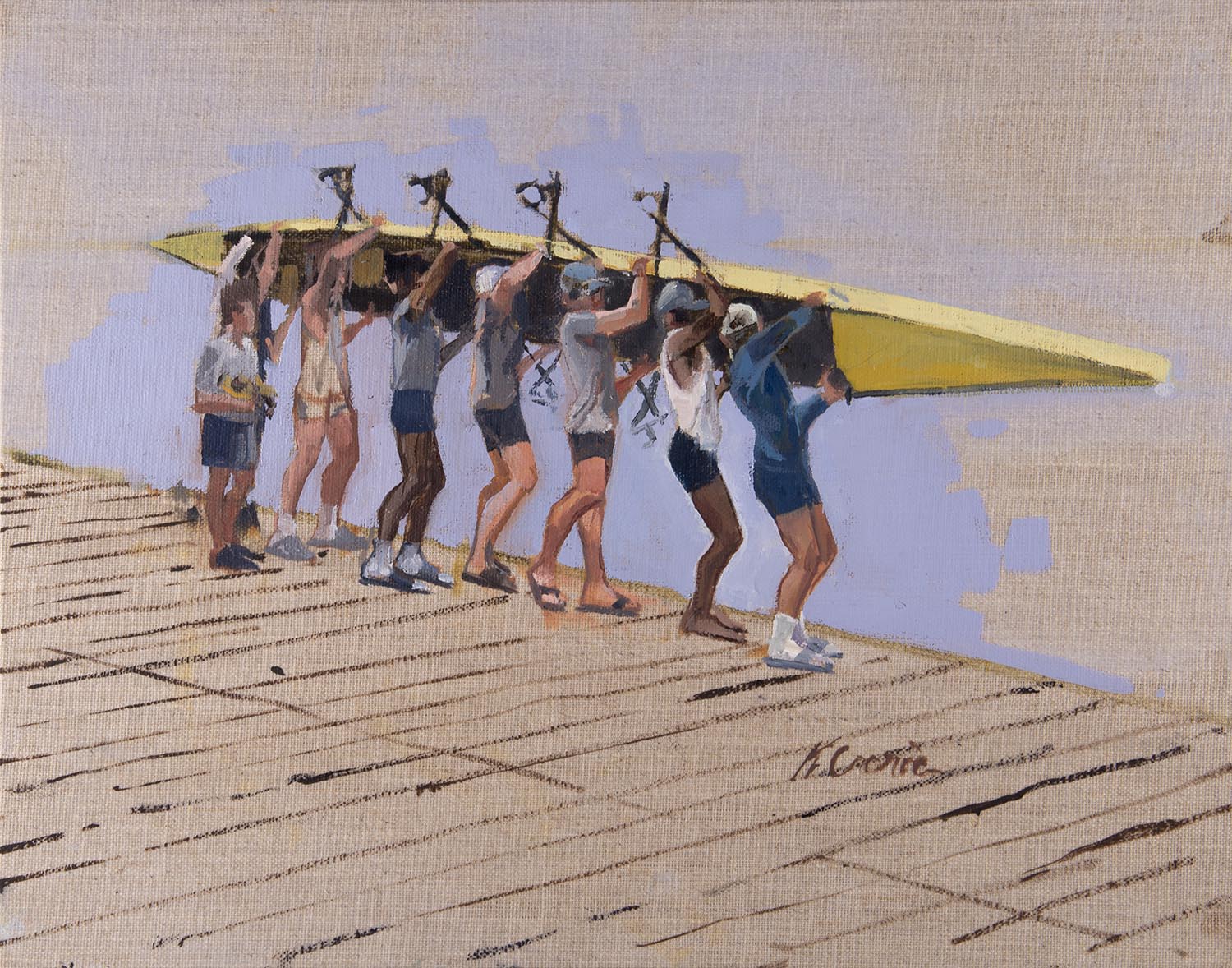 “All Eight” is a series of paintings nodding to the dedication of Navy Rowing. From catch to feather to bedding down the shells for the night, the sport requires a synchronized effort of both grit and grace. These paintings aim to explore the familiar moments in the midst of the dedication. Paintings aim to feel anonymous while inviting the viewer into their world. Images of Navy Men’s Heavyweight, Navy Men’s Lightweight, and Navy Women’s Rowing teams.