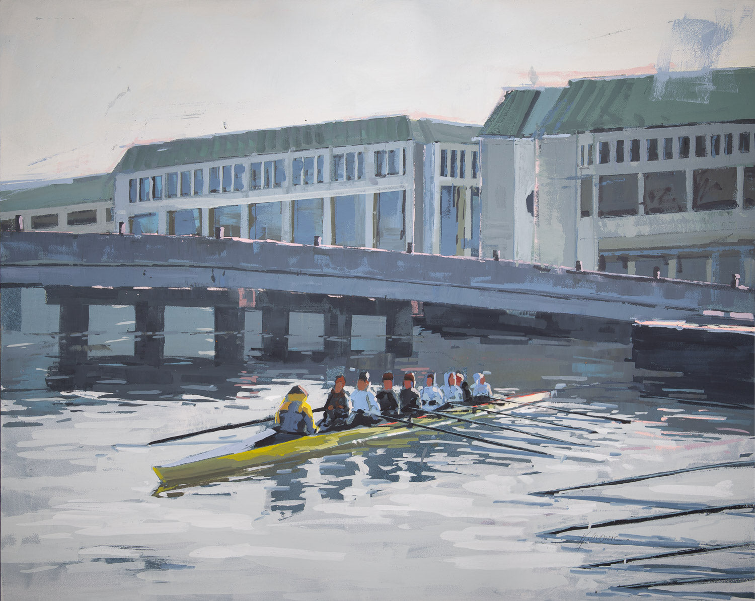 “All Eight” is a series of paintings nodding to the dedication of Navy Rowing. From catch to feather to bedding down the shells for the night, the sport requires a synchronized effort of both grit and grace. These paintings aim to explore the familiar moments in the midst of the dedication. Paintings aim to feel anonymous while inviting the viewer into their world. Images of Navy Men’s Heavyweight, Navy Men’s Lightweight, and Navy Women’s Rowing teams.