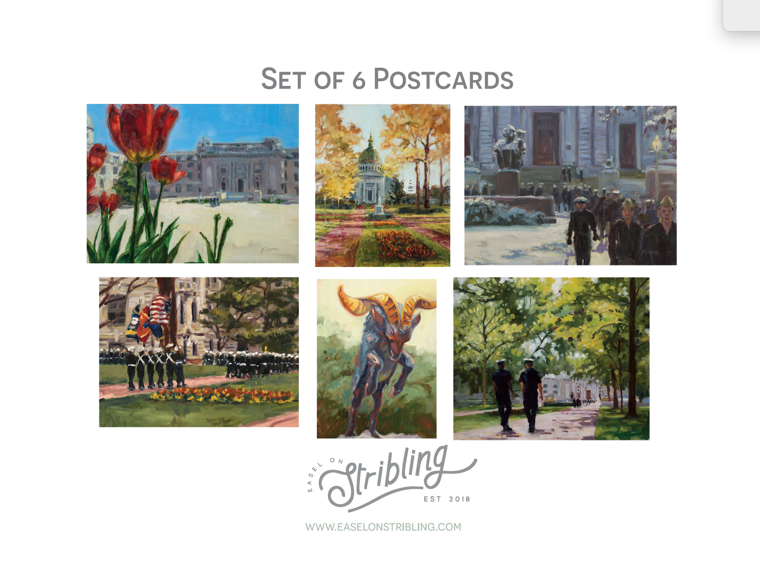 Send a little piece of the Yard through the mail—or keep them for yourself as mini works of art. This set of six unique postcards features original paintings of iconic Naval Academy scenes, from the crisp march of the Brigade to quiet strolls under leafy trees.